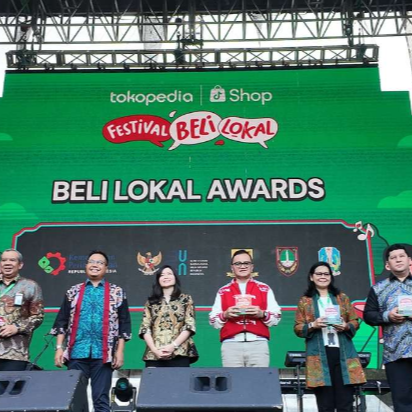 Penghargaan diterima oleh Plt. Kepala Dinas Perdagangan dan Perindustrian Kota Bandung, Ronny Ahmad Nuruddin dari Direktur UtamaTokopedia dan Shop Tokopedia, Melissa Siska Juminto, pada acara Festival Beli Lokal Awards Inovator Program UMKM di Gelora Bung Karno (GBK) Arena Plaza Timur, Jakarta (25/8/2024).