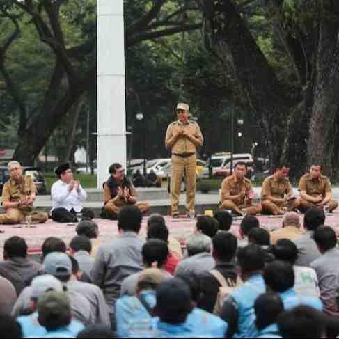 Ratusan petugas Dinas Lingkungan Hidup Kota Bandung mengikuti kegiatan evaluasi di Plaza Balai Kota Bandung, Senin (14/10/2024).Kegiatan yang berfokus pada edukasi terkait pengangkutan dan pemilahan s...